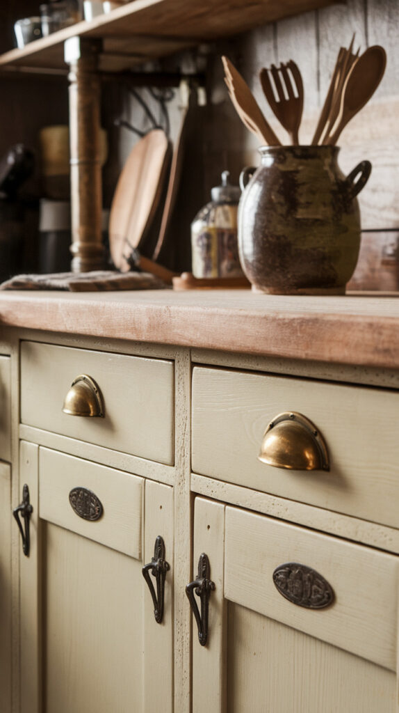 Sometimes the smallest upgrades make the biggest difference. Replacing modern cabinet hardware with rustic or vintage-style handles can completely shift the kitchen’s personality.