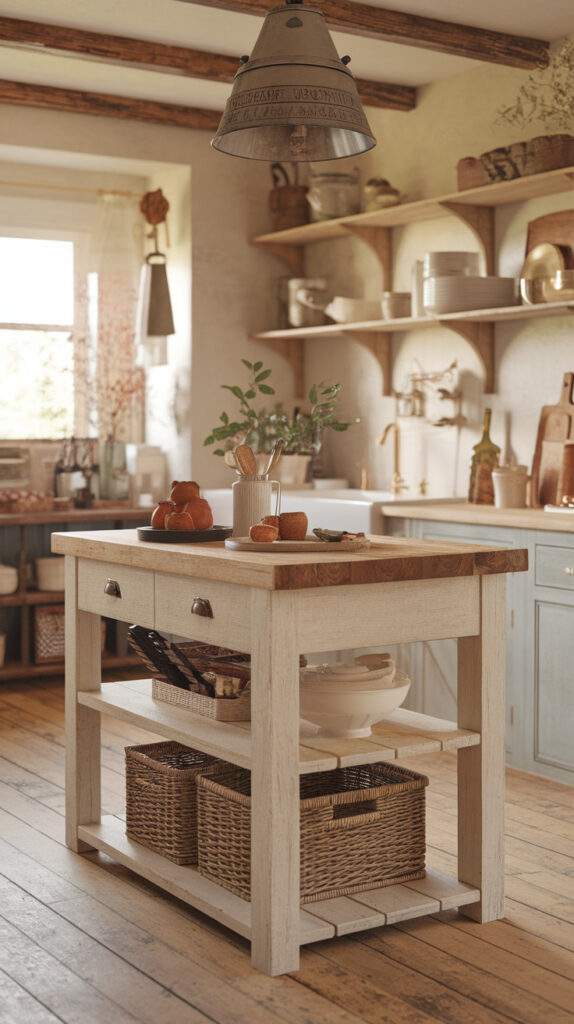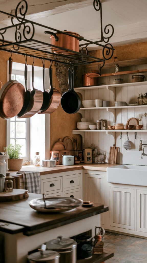 Rustic kitchens work best when storage blends into the design. Open shelving, hanging racks, and baskets often look better than bulky cabinetry.