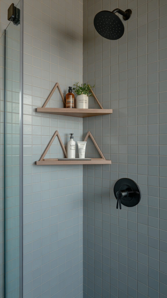 Go for simple triangular shelves in clear acrylic, brushed metal, or matte black. These finishes blend with most bathroom styles and keep the setup looking intentional instead of cluttered.