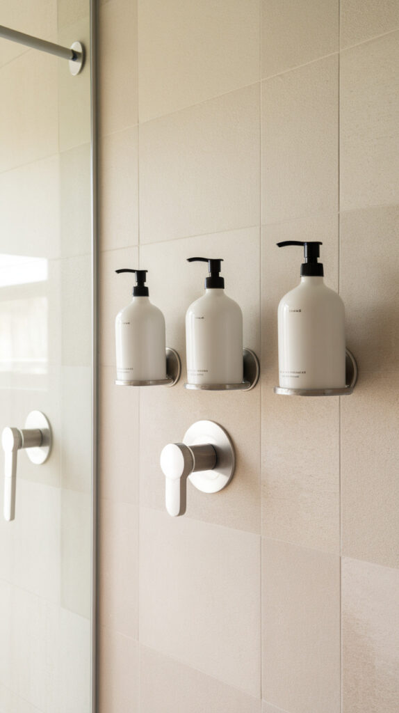 Random bottles clutter small showers faster than anything else. Wall-mounted dispensers eliminate that chaos.