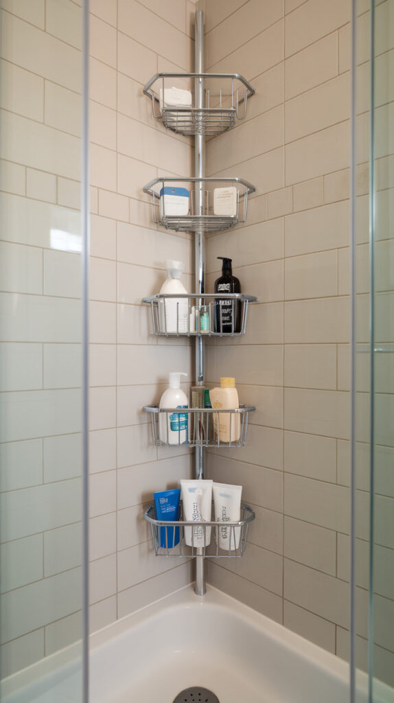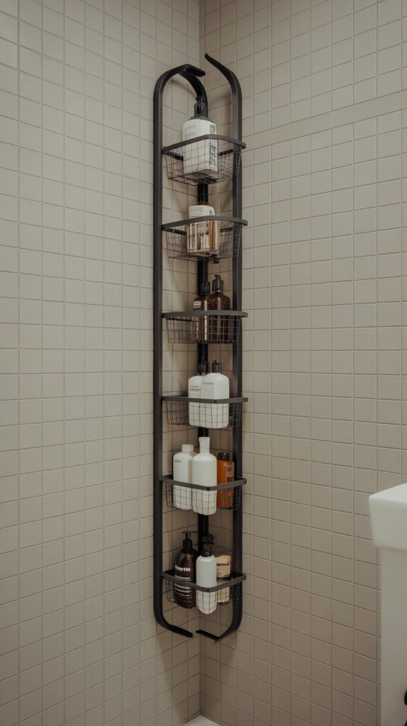 Vertical storage prevents product crowding along shower ledges. When bottles stack upward instead of outward, the entire shower floor clears instantly.