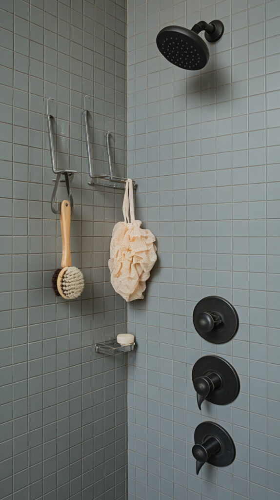 Some shower items don’t belong on shelves at all. Loofahs, brushes, and razors often work better when they hang.
