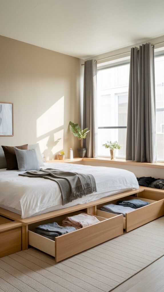 This idea works because the bed already eats the most floor space in the room. Storage drawers turn that dead zone into a workhorse without adding clutter or furniture bulk. I love how clean the room feels once everything slides out of sight.
