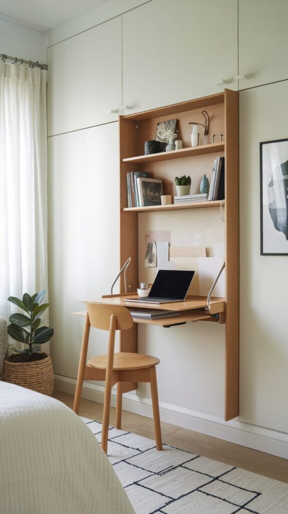 This setup keeps surfaces clean. Focus improves instantly. The room still feels like a bedroom. Hidden storage reduces visual stress. Work zones stay defined. Cleanup feels fast.