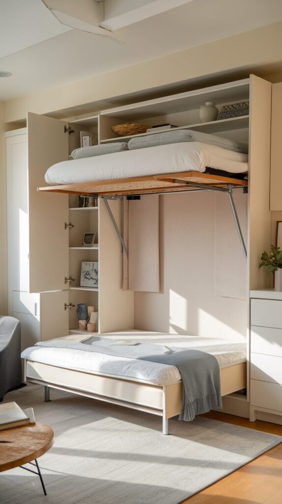Murphy beds feel dramatic, but they solve real problems. They free floor space during the day completely. I’ve seen studios transformed by one move.