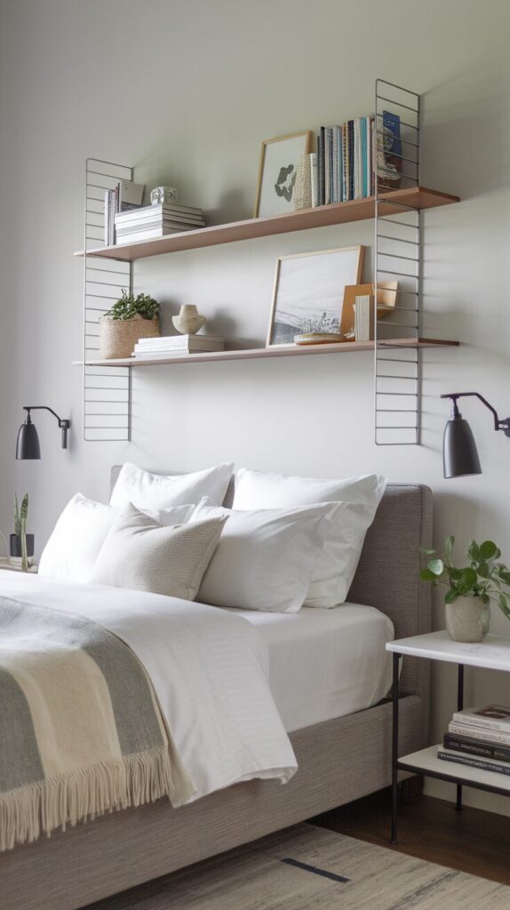 The wall above the bed often sits empty out of fear. Floating shelves change that safely. I use them for books and minimal decor.