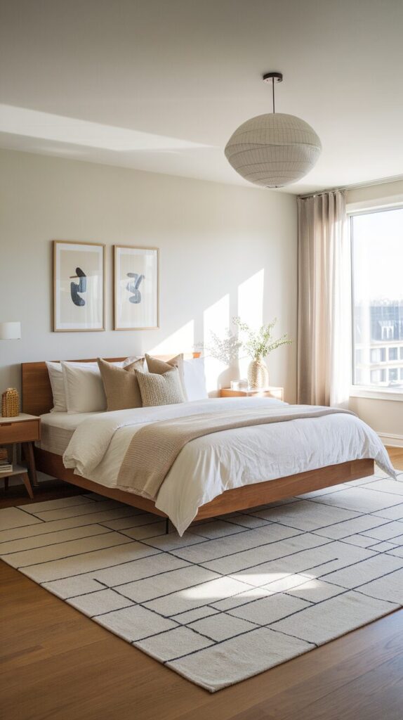 Size matters more than pattern here. Avoid tiny rugs that float awkwardly. Use subtle patterns if your bedding stays simple.