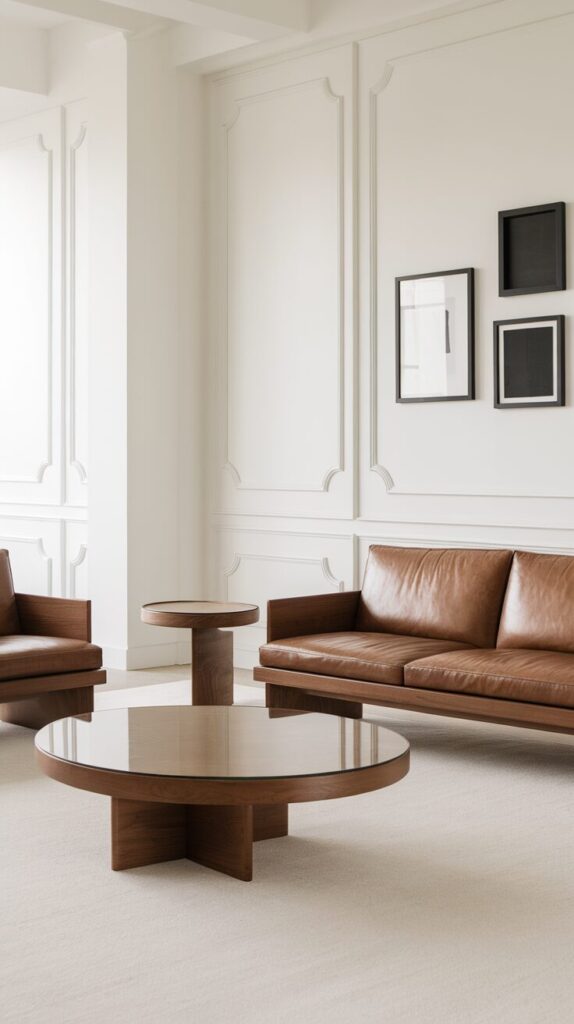 If you’re into simplicity, start with sleek brown pieces like a low-profile sofa or coffee table, then let white dominate the background. Add a few black accents—maybe in hardware or frames—to sharpen the look and prevent it from feeling too soft.