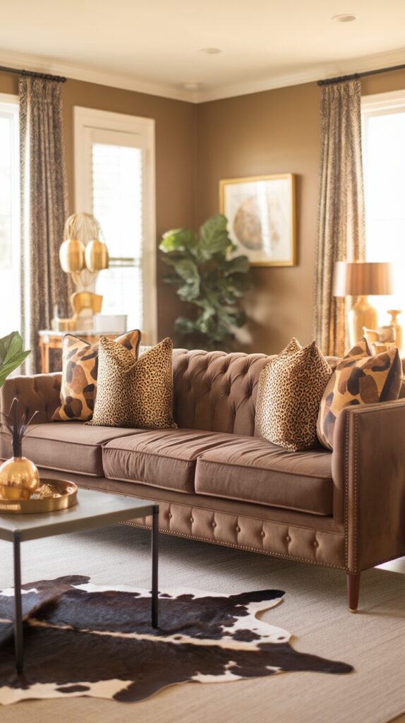 Here’s a playful way to spice things up: add animal prints into your brown living room. Leopard, cheetah, or even cowhide accents bring personality and flair without feeling over-the-top.