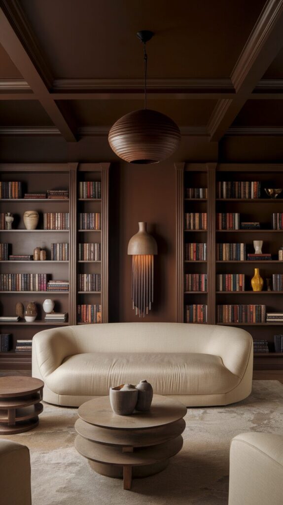 Think beyond sofas and walls—brown can shine in more surprising spots. Painting a ceiling deep brown? Instant coziness. Adding brown bookcases or brown-toned artwork? Layers of interest without extra clutter.