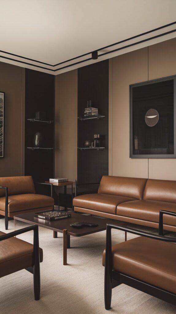 Try black frames on the walls, matte black hardware, or slim-legged black furniture against your brown tones. These touches sharpen the space, giving it structure and edge.