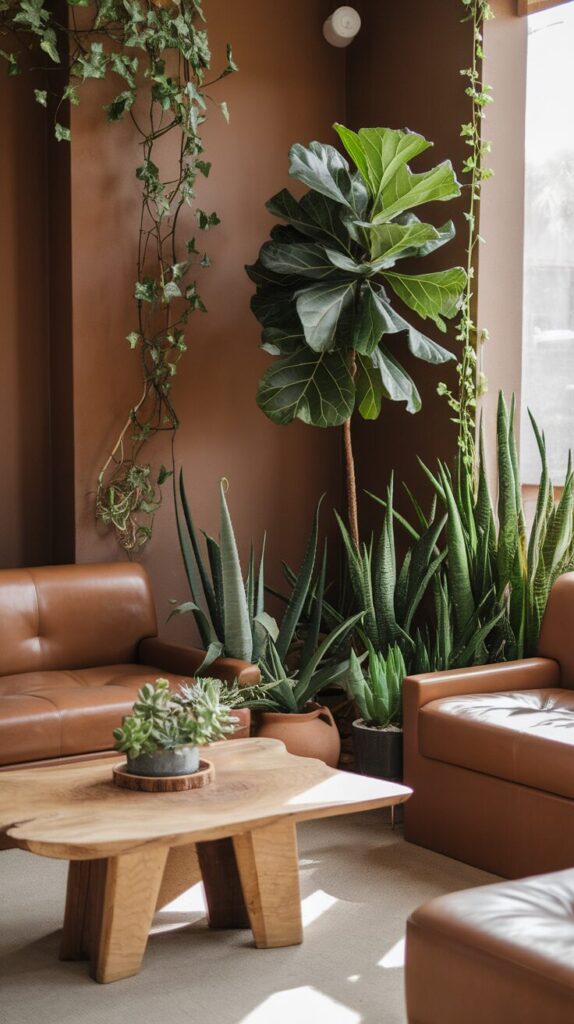 Nothing pairs with brown quite like green. Big leafy plants, trailing vines, or even small succulents inject freshness and energy into the space. It’s like your living room is breathing again.