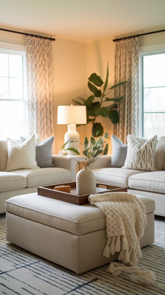 This option works best if you like cozy vibes and flexible seating. You can prop your feet up, slide it around, or use it as extra seating when people crowd the sofa. It feels relaxed without looking sloppy when you style it intentionally.