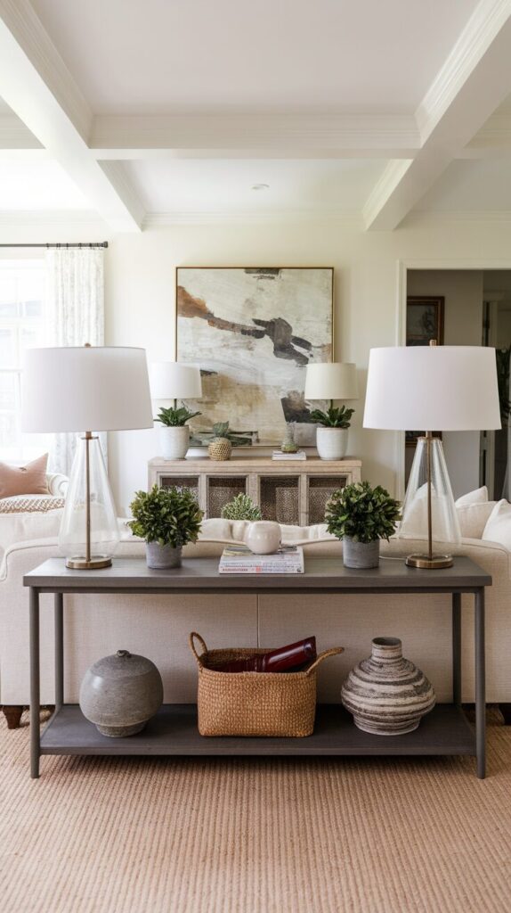 Console tables define space and add balance behind large furniture. They improve flow and prevent the sofa from floating awkwardly. You also gain useful surface space without cluttering walkways.