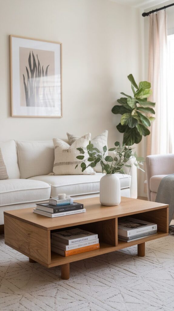Hidden compartments keep remotes, books, and random items out of sight. The room instantly looks calmer without daily cleanup marathons.
