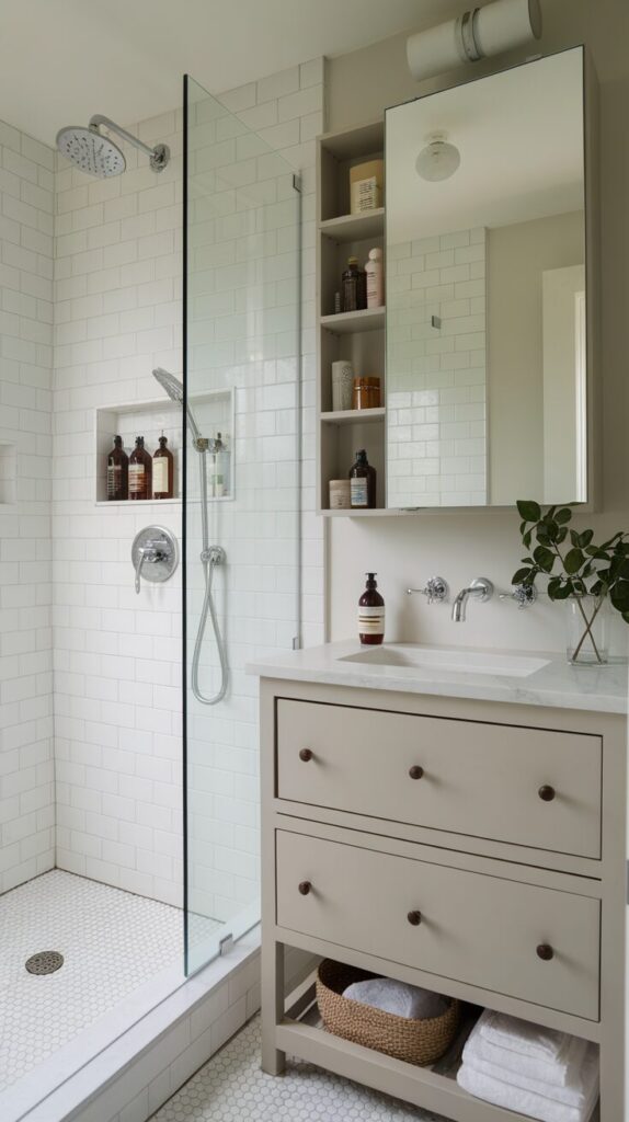 Vertical storage, recessed niches, mirrored cabinets, and under-sink drawers are ideal. Hidden storage keeps surfaces clutter-free and maintains a clean look.