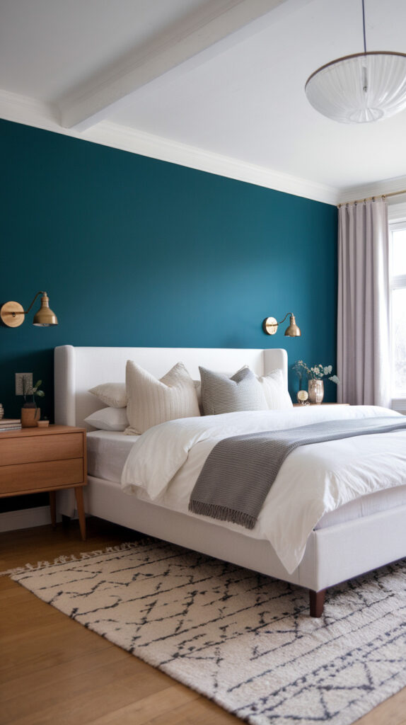 Your eyes naturally land on the wall behind the bed first, so giving it color creates structure. Teal adds depth, which makes the room feel larger and more layered. It also pairs beautifully with wood tones, white bedding, and warm metals, so it doesn’t force you to replace everything you own.