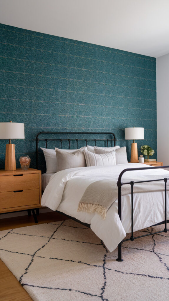 Paint is great, but wallpaper can add texture and pattern that paint just can’t compete with. A teal wallpaper accent wall makes a bedroom feel stylish and expensive, especially if you choose something with subtle metallic details or a soft geometric design. I’ve used peel-and-stick wallpaper before, and honestly, it’s way easier than people think.