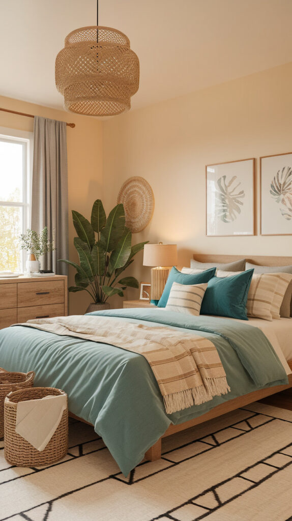Layered textiles add depth and softness, which makes the room feel inviting. Teal brings in a fresh color that doesn’t feel overly loud. It also helps create a designer look because it makes the bed feel intentionally styled.