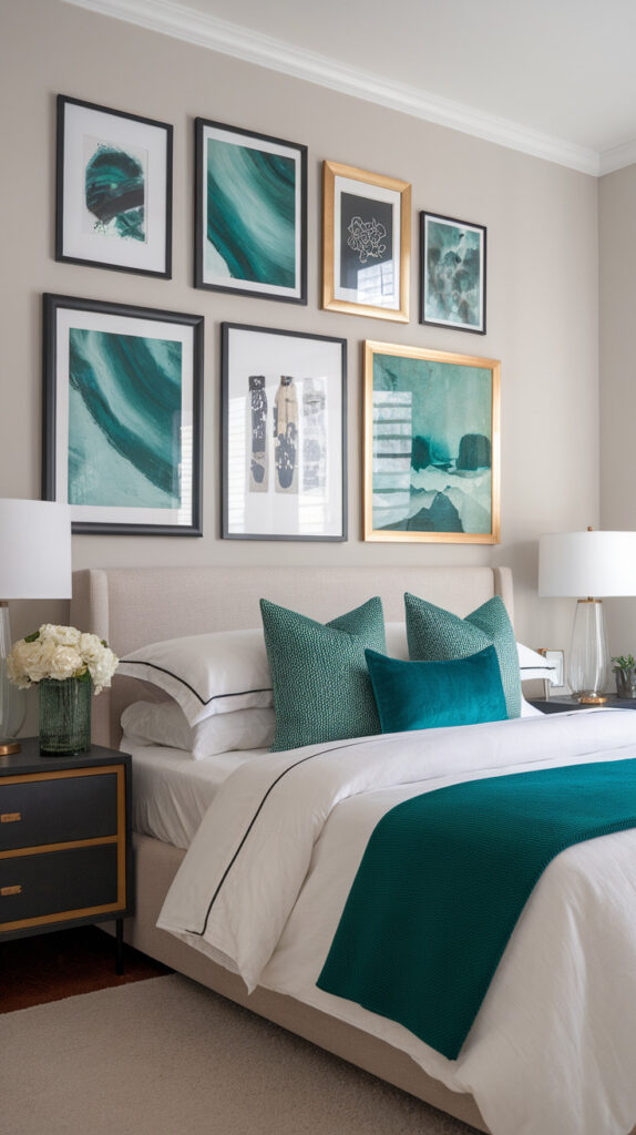 Blank walls make bedrooms feel unfinished, but random wall art can make them feel messy. A teal-themed gallery wall gives you structure while adding personality. The key is picking pieces that share a similar color palette and style. I’ve done a gallery wall before with teal accents, and it made the room feel way more curated.
