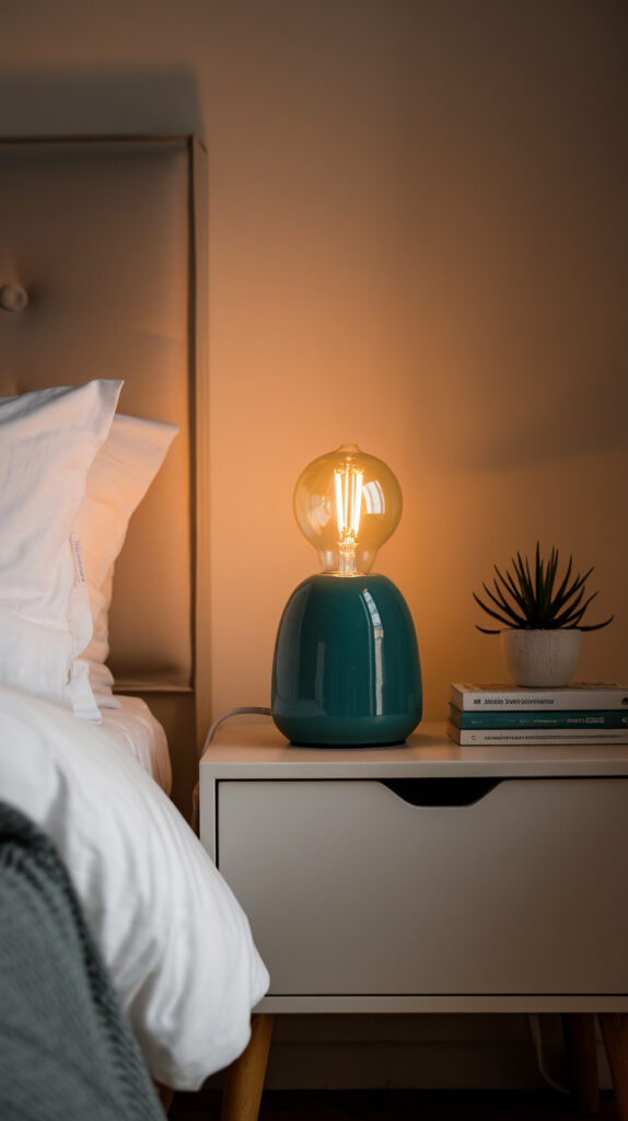 Teal ceramic lamps look classy and timeless, while teal glass lamps feel more modern. Avoid overly bright neon teal because it can look cheap under strong light. Pair teal lamps with neutral nightstands so they stand out properly.