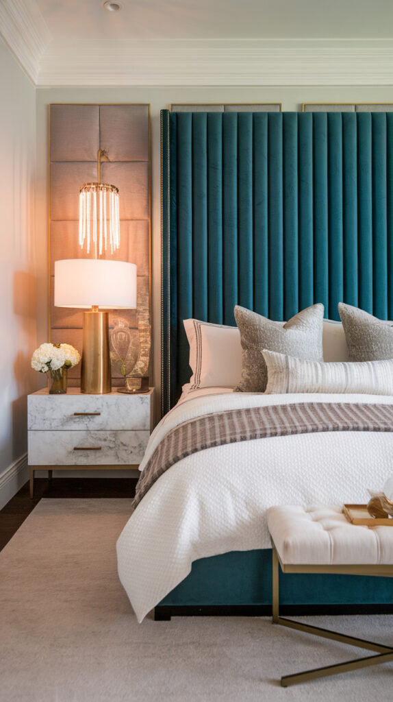 Velvet teal looks glamorous and modern, while linen teal feels more casual and coastal. Avoid overly bright turquoise unless you want the room to feel more playful than relaxing. If your room is small, go with a headboard that has clean lines instead of huge tufting.