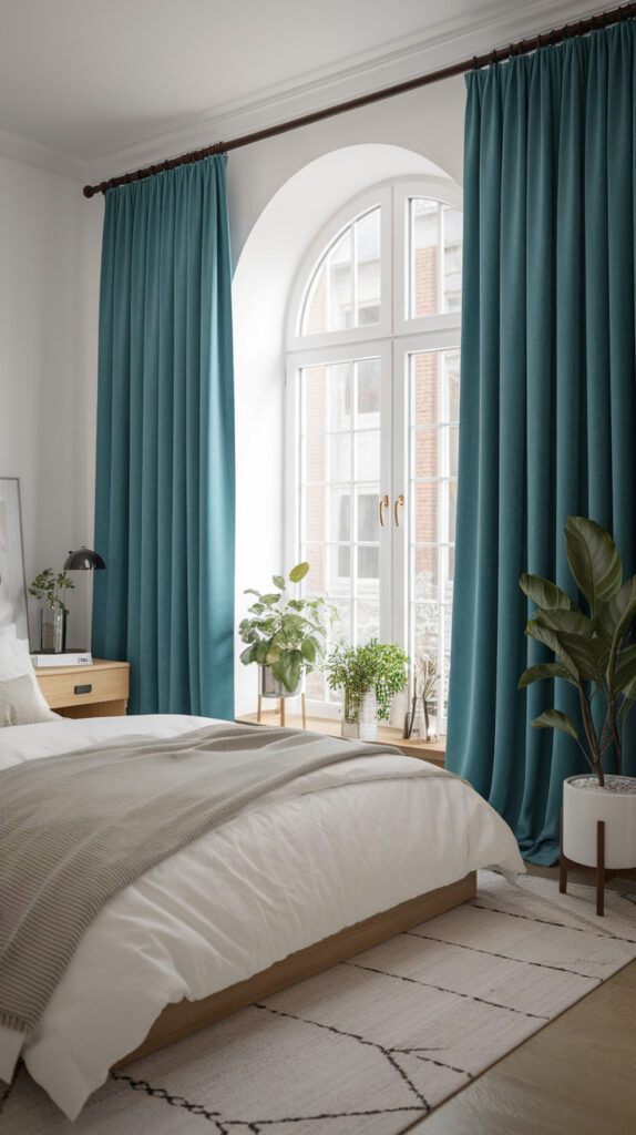 Curtains also help with light control, which matters a lot if you like sleeping past sunrise. Plus, teal fabric looks rich when it catches natural light.