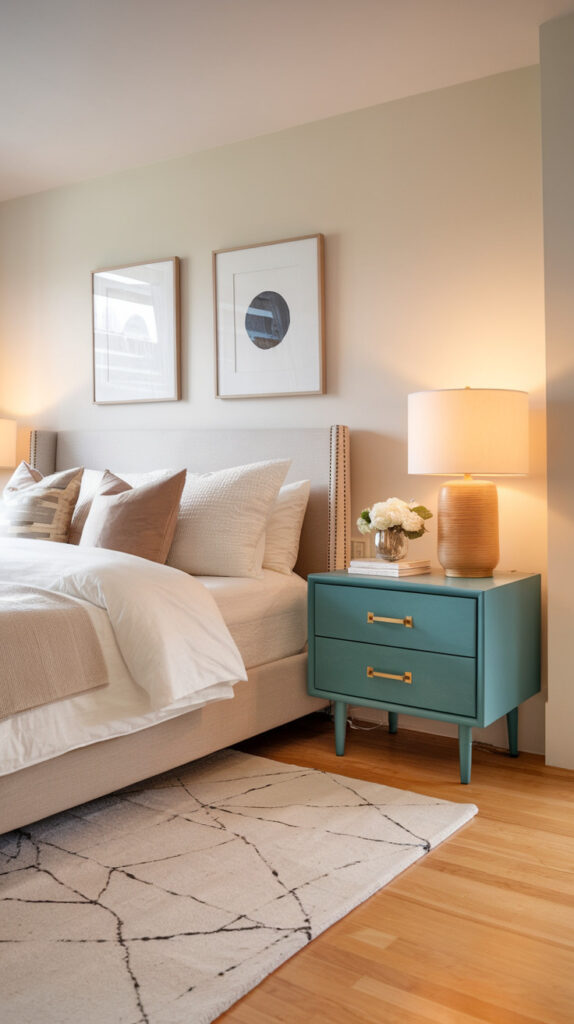 Nightstands sit right next to the bed, so they naturally get attention. Adding teal there creates balance and contrast without dominating the room. It also helps tie together teal accents like pillows, rugs, or artwork.