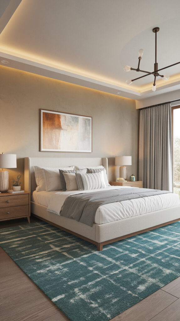 Teal rugs work especially well in neutral bedrooms because they add contrast without looking chaotic. They also make the bed area feel more grounded and cozy.