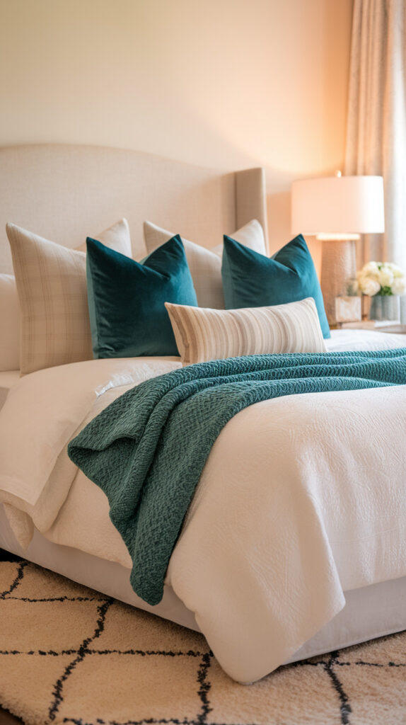 Mix textures to make the bed feel styled instead of flat. A teal velvet pillow with a white linen pillow looks expensive even if both were budget buys. Avoid overly shiny satin teal unless you want the bed to look like it belongs in a questionable romance movie set.