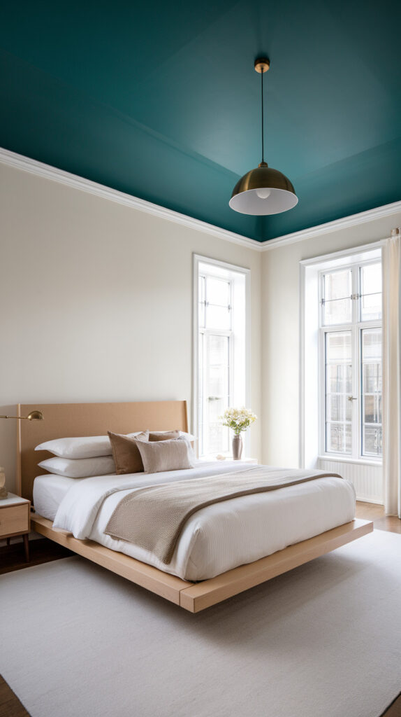 This idea works best if your walls are light and your furniture is simple. If you already have a lot going on, adding a teal ceiling might push the room into “too much” territory.
