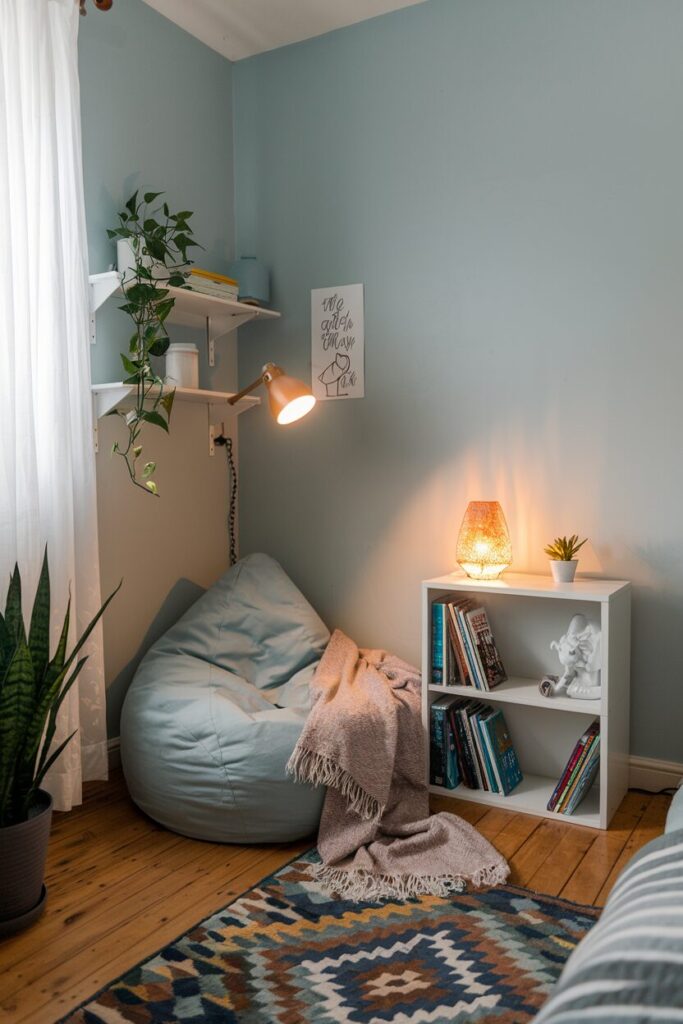 Even the tiniest bedroom can fit a cozy reading nook if you get creative. A beanbag or small armchair instantly makes a corner feel like a personal retreat—perfect for books, journaling, or just zoning out.
