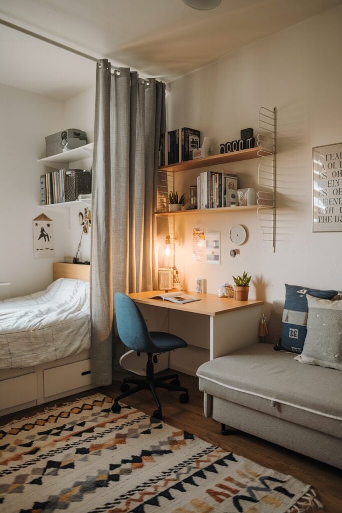 Small rooms work harder when you divide them into zones. Define your sleep area, study space, and chill corner so each one feels purposeful.
