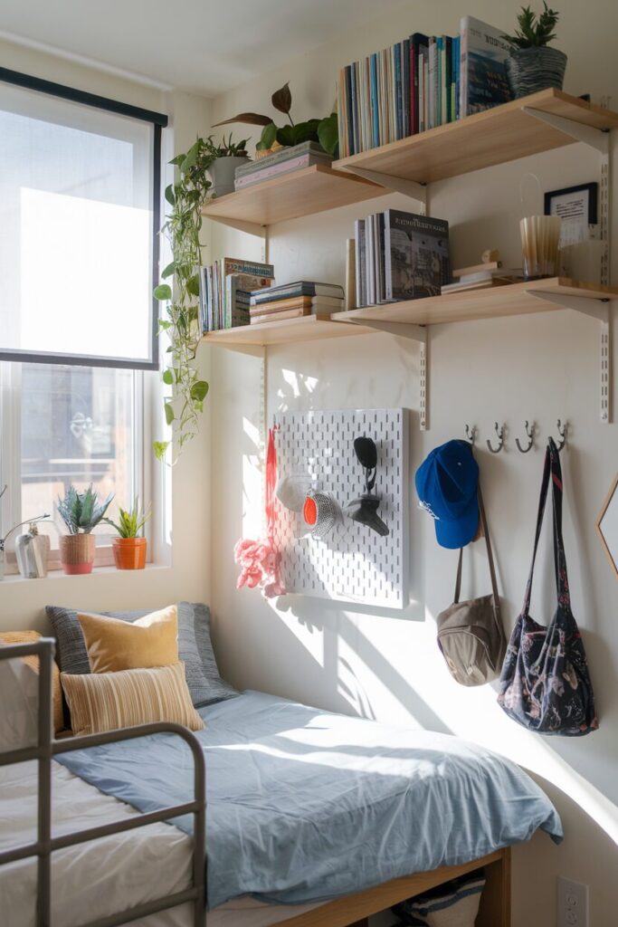 When floor space is scarce, go vertical—your walls are basically free real estate. Floating shelves can hold books, plants, and those random trinkets you can’t let go of. They look sleek and keep your desk clear for, you know, “studying.”
